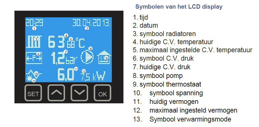 Voor aansturing van het verwarmingssysteem adviseert Mikoterm het gebruik van een ruimtethermostaat (0-5V open/close). De besturing wordt volledig geregeld via een slimme CPU-unit en is eenvoudig te bedienen via een groot LCD-scherm met soft touch knoppen. Op dit display is alle informatie over de werking van de ketel overzichtelijk weergegeven. U kunt onder andere kiezen tussen normale verwarmingsmodus en antivriesmodus. Instellingen aanpassen gaat snel en intuïtief, waardoor de ketel zeer gebruiksvriendelijk is.