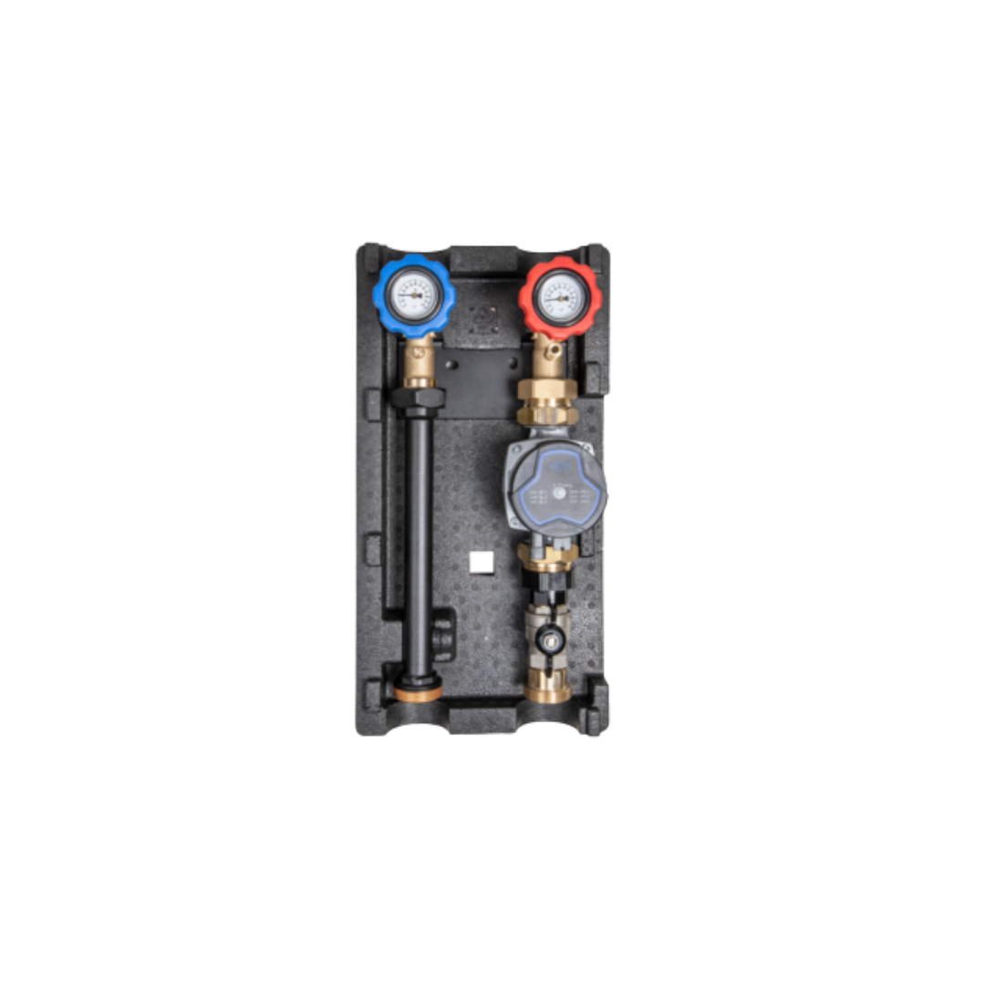 Dankzij de kogelkranen is eenvoudig onderhoud van de pomp mogelijk zonder het hele systeem te hoeven af te tappen. Schroefkoppelingen worden gebruikt als passtuk voor de verschillende pomplengtes. Dit zorgt voor een flexibele reactie in geval van service. De geïntegreerde thermometers maken het eenvoudig om de huidige temperatuur in de aanvoer en retour te controleren. De isolatie vermindert warmteverlies naar de omgeving.